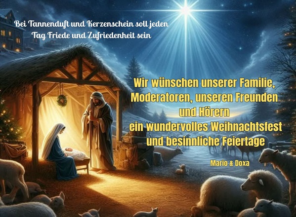 Wir wünschen allen Hörern, Modis und allen Gleichgesinnten friedliche, besinnliche Feiertage mit "unserem Sender". Liebe Grüße aus Österreich Christl und Peter musik